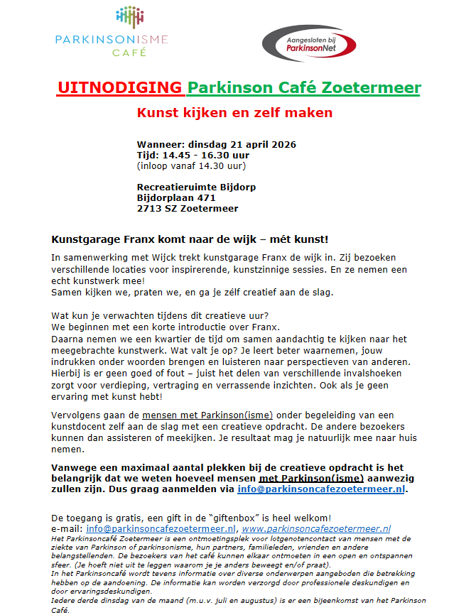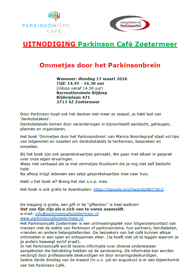 info@parkinsoncafezoetermeer.nl of parkinsoncafezoetermeer@gmail.com